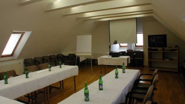 klimatizovaná konferenční místnost s kapacitou 50 osob zahrnuje TV/SAT/VIDEO, dataprojektor, zpětný projektor pro LCD panel, plátno, flipchart