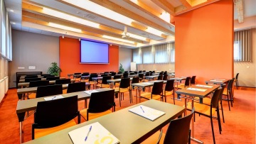 Společenský sál I /120 m2/: podlaha – koberec, denní světlo s možností blackout zatemnění, dataprojektor s plátenm 3x2 m, internetová přípojka, flipchart, ozvučení
