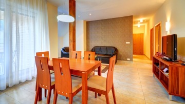 Vybavení apartmánů: 3x dvoulůžkový pokoj, konferenční stůl se sadačkou a křesly / kuchyňský kout s jídelním stolem / koupelna s vanou, sprchovou zástěnou a WC, samostatné WC, vysoušeč vlasů / LCD-TV, telefon, trezor / Wi-Fi připojení zdarma / úložné prostory v chodbě, možné dvě přistýlky v obývací části 90x190 cm