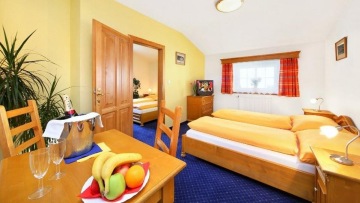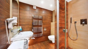 Vybavení pokojů: dřevěný nábytek, psací stolek, TV se satelitem, trezor, prostorná luxusní koupelna se sprchovým koutem a sociálním zařízením