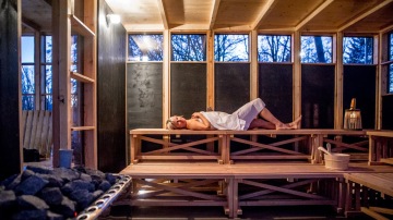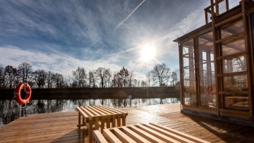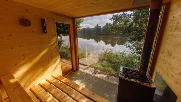 V areálu jsou dvě stylové finské sauny, jedna se nachází přímo na řece na plovoucím mole, druhá na břehu řeky. Obě sauny mají výhled na řeku a poskytují možnost ochladit se přímo v řece nebo ve sprchách, které se nacházejí na břehu řeky. K dispozici je i odpočívárna na hrázi určená pro relaxaci po saunování.
