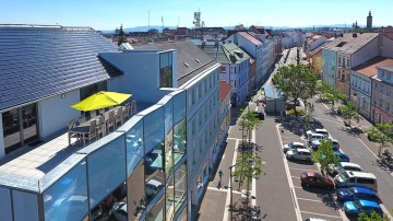 Terasu v nejvyšším poschodí budovy školícího centra lze v teplých dnech využít pro venkovní afterparty.