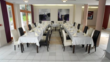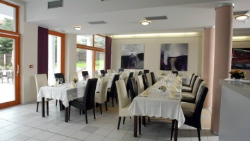 Hotelová restaurace v moderním stylu spojená se zahradní restaurací je vhodná jak pro příjemné posezení ve dvou, pro rodinnou oslavu, tak i pro svatební hostinu s obřadem či garden-party. Příjemnou rodinnou atmosféru a soukromí pro Vaši společnost zaručí luxusní salonek s maximální kapacitou 35 osob. I konferenční místnost v moderním stylu můžete využít pro formální schůzky či pracovní obědy.